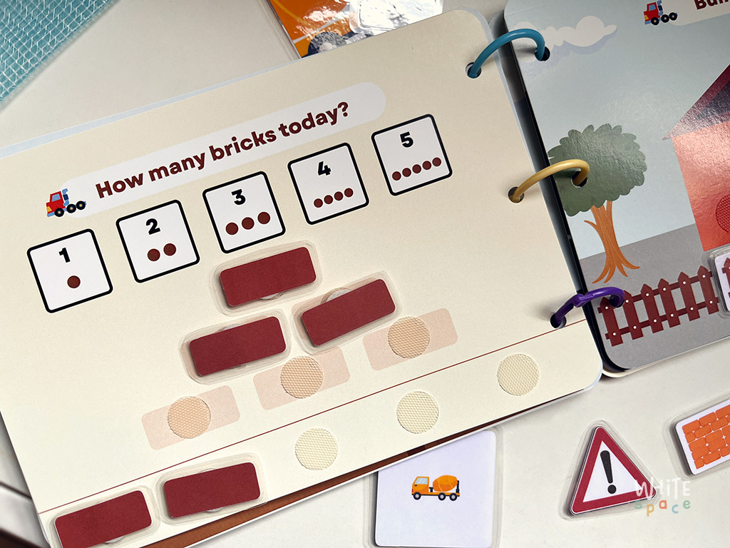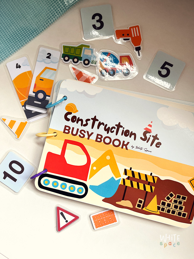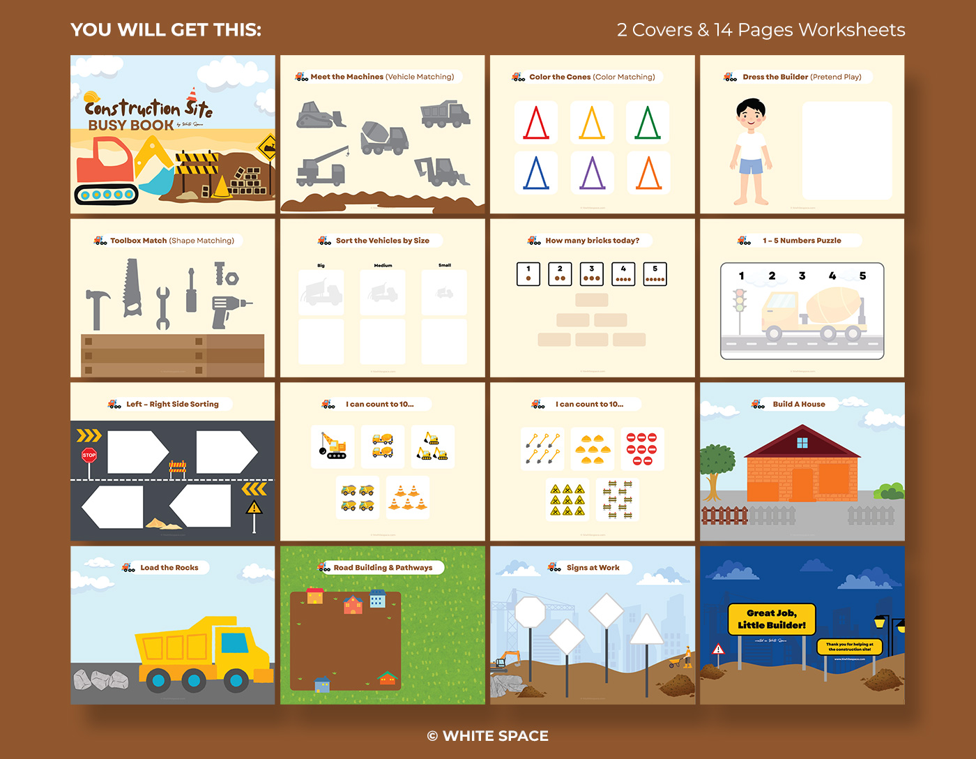 Construction Site Busy Book – Printable PDF, Full Colour Illustration. 14 pages worksheets + 2 covers + Cut out pages(60+ activities cards). Suitable for ages 2+. This is a DIGITAL DOWNLOAD only – no physical product will be shipped.